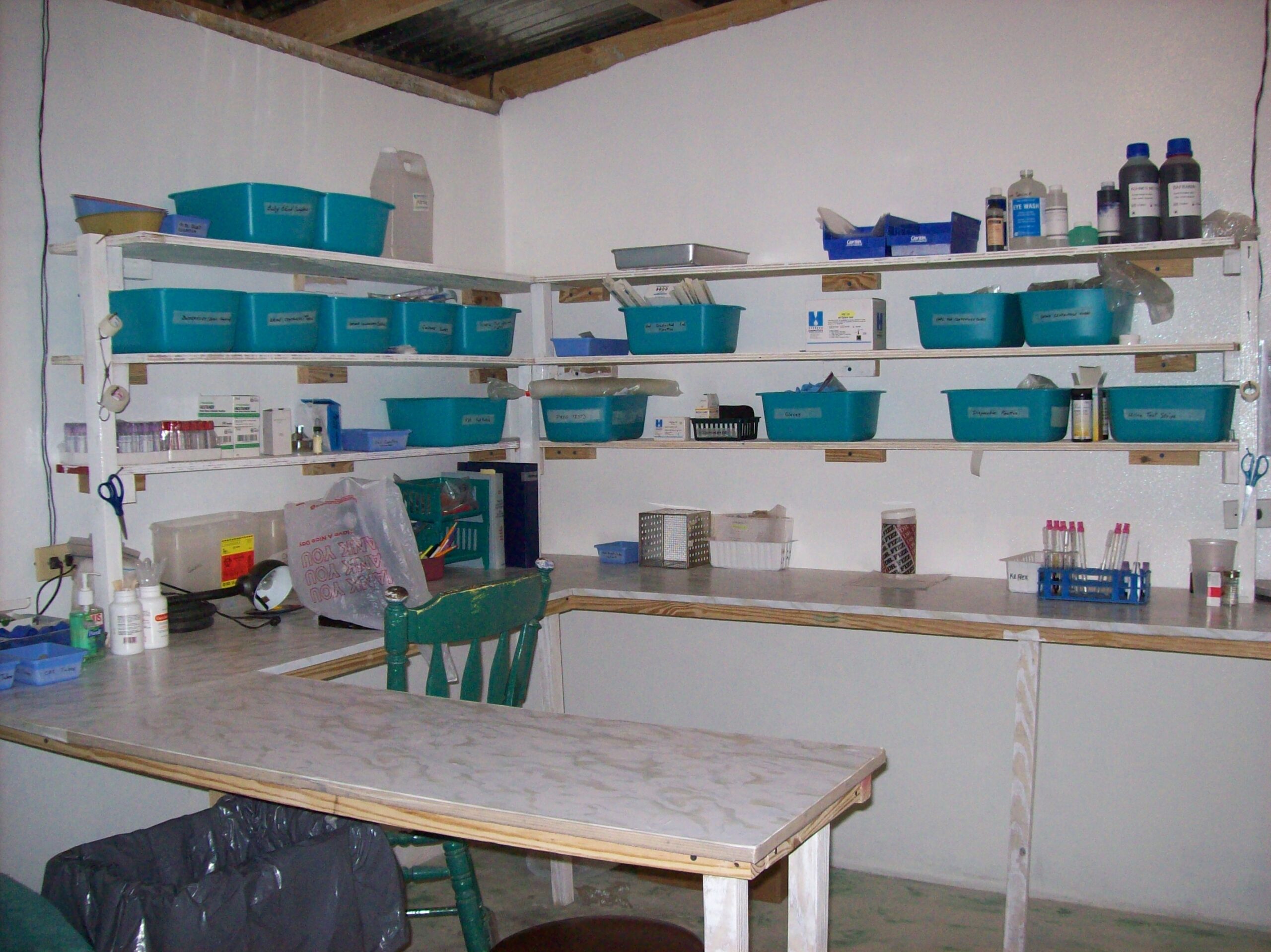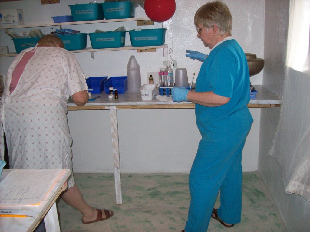 That dream became reality thanks to a team of volunteers from ACWAM (Active Christians With A Mission) from Canada. In early 2008, the clinic owner had decided to build a second level and needed to construct a septic pit. That project gave us the space we needed to finally create a lab—one humble room built on top of that pit, finished with shelves and tables just in time for the ACWAM team to arrive in March. Two lab techs came to train our staff and help us set everything up.