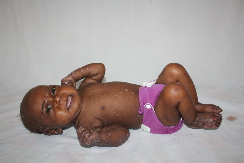 Djounaica is five months old and weighs 9 pounds. She came to our clinic after six days of diarrhea and two months of skin sores. Her hair was falling out, and she was referred by another clinic for advanced care. She is severely malnourished at -3SD rating.