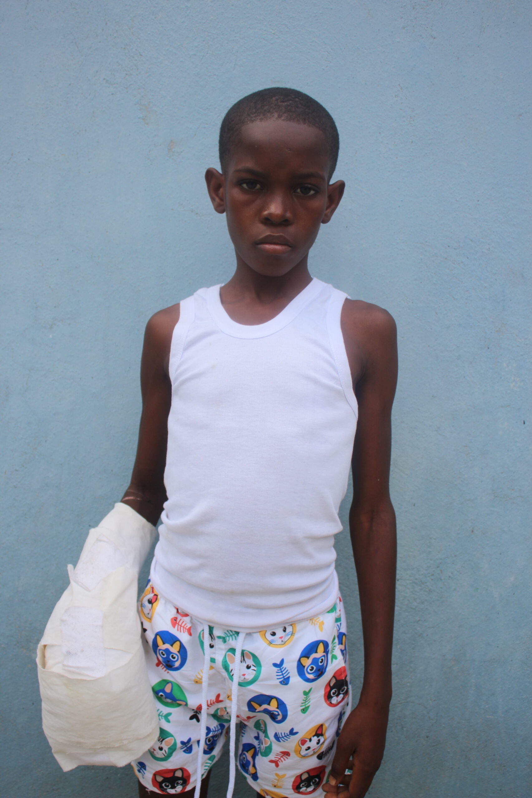 Josaphat is a 13-year-old boy who suffered a severe burn to his hand. His family first went to a nearby clinic, but it did not have the proper wound care supplies to treat him. Since his injury requires daily dressing changes, and his family cannot travel back and forth each day, he was admitted to our clinic for ongoing care. His mother is staying with him during his healing process.