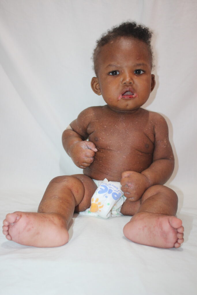 Nael is 10 months old and weighs 15 pounds. He arrived at our clinic with severe 3+ edema from kwashiorkor. His body was swollen, his hair was falling out, and he had developed sores on his skin. The swelling had begun one week earlier.
